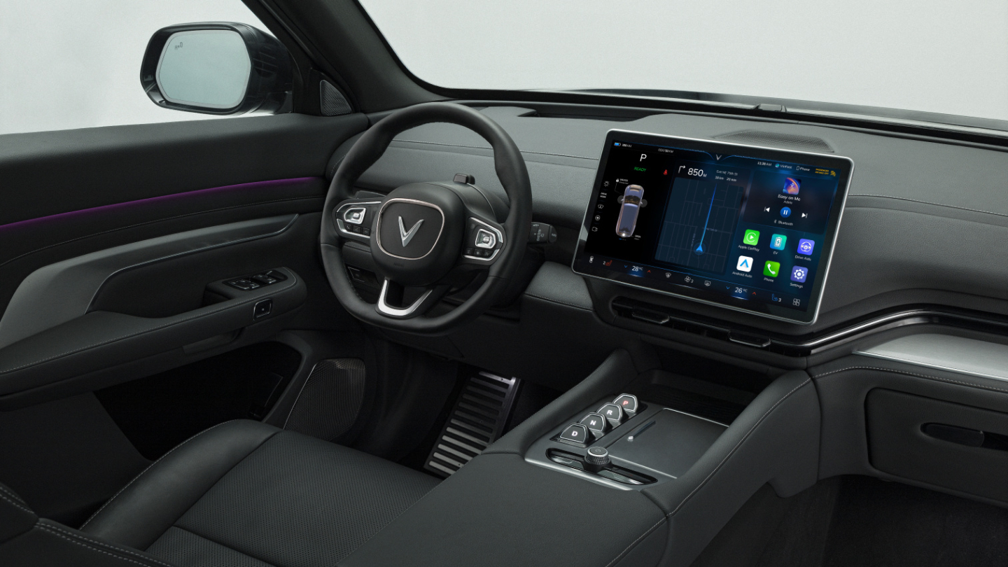 VF9 mang phong cách tối giản nhưng sang trọng với vật liệu da nhân tạo cao cấp. Phiên bản Eco có hai tùy chọn màu nội thất (nâu Saddle Brown và đen Granite Black), trong khi bản Plus bổ sung thêm màu xanh Navy Blue và be Cotton Beige.
